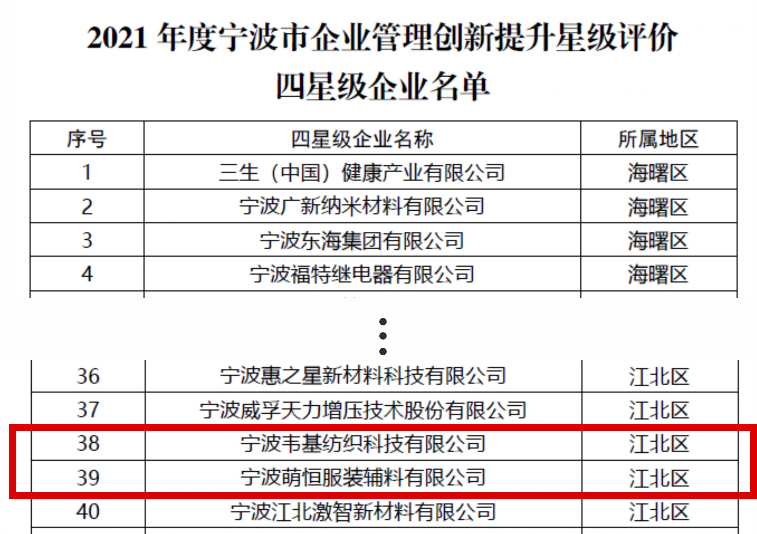 韋基紡織科(kē)技(jì)有(yǒu)限公司、萌恒≠✘¥>服裝輔料有(yǒu)限公司獲批甯波市(shì)企業(yè)管≠π理(lǐ)創新四星級企業(yè)
